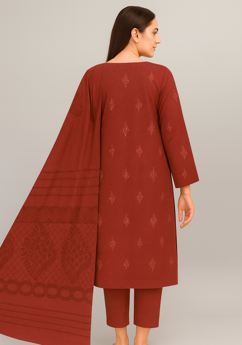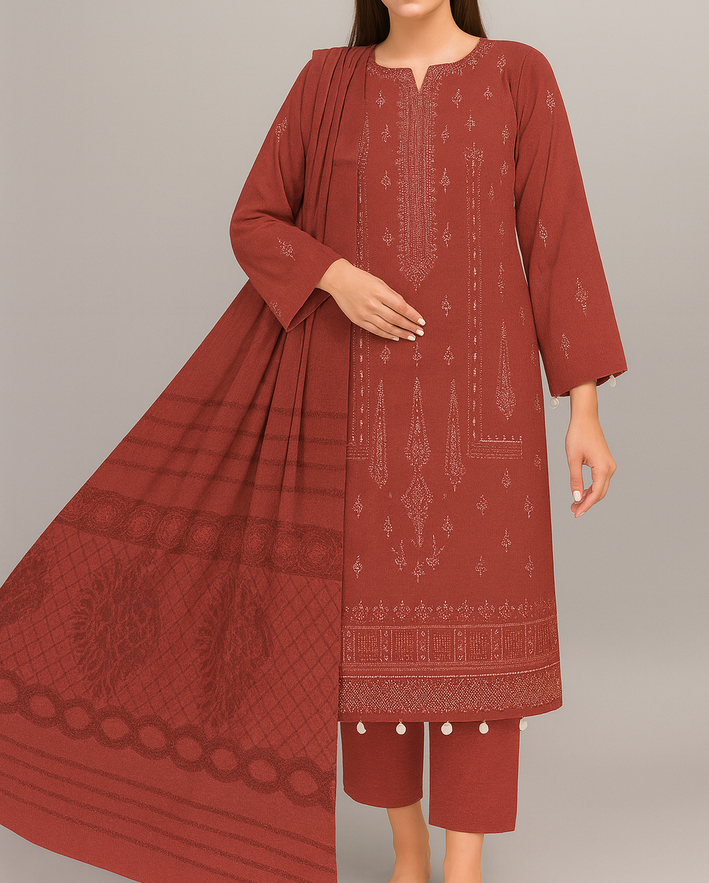 Dhanak Double-Head Embroidered 3-Piece Suit – Red